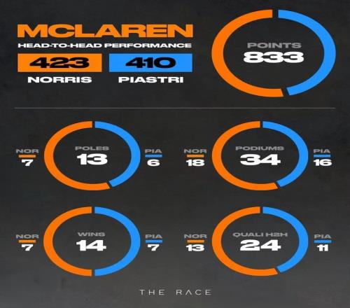皮亚斯特里的大部分胜利发生在上半赛季,而诺里斯的获胜分布则更为均匀,他曾在澳大利亚(第1站)、摩纳哥(第8站)、奥地利(第11站)、英国(第12站)、匈牙利(第14站)、墨西哥(第20站)和圣保罗(第21站)站上最高领奖台。