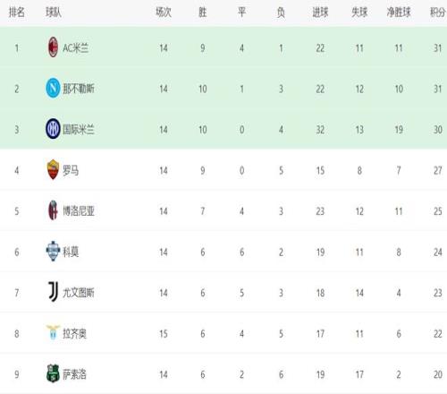 在积分榜上,前2的积分相同。AC米兰9胜4平1负,拿到31分,排名榜首。那不勒斯10胜1平3负,也是拿到31分,只是净胜球少1个,只能排名第2。第3的是国际米兰,以30分排名第3。第4的是罗马,拿到27个积分。博洛尼亚以25分排名第5。第6的是科莫,拿到24分。尤文图斯以23分排名第7。拉齐奥赢球之后,总积分达到22分,排名第8。亚特兰大虽然赢球了,但总积分依然很少,只有19分,排名第11。