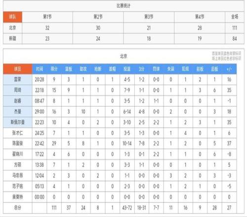 作为CBA的两支传统强队,北京vs新疆的比赛结果令人意外,两人没有进行所谓的拉锯战,而是上半场就奠定了比赛的局势。第一节,北京男篮在赵睿和周琦这两位前新疆球员的带领下,以32:23领先9分,第二节,随着陈盈骏的爆发,分差进一步被拉开至15分。下半场尽管新疆男篮力求追分,但这赛季的北京阵容深度雄厚,丝毫没给新疆机会,球队最终以111:84赢下比赛。