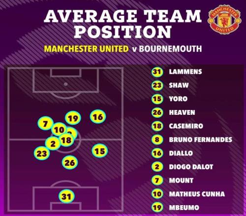从表面看,曼联还是三中卫,但流转起来确实会变成四后卫。在控球时,阿马德位置前移,约罗站到右后卫位置,而左后卫迪奥古·达洛则更多内收到后腰区域,阵型在343和433之间变化。