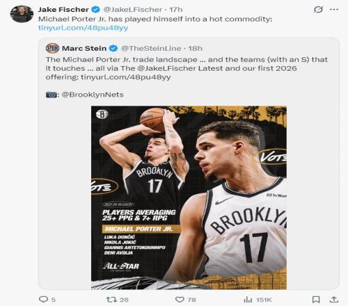 根据BR记者杰克-费舍尔的报道,活塞正在努力的交易得到小迈克尔-波特,活塞不希望进行过于激进的行为,但用一个首轮签+配平薪资换来一个场均25.8+7.5的出色得分手活塞还是有很大兴趣,活塞管理层希望尽快走出23-24赛季14胜68负的阴霾。