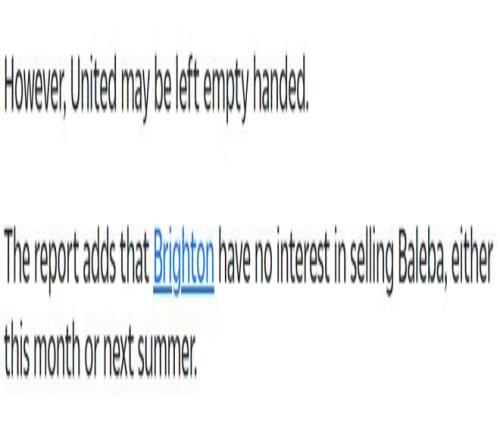 巴莱巴本人非常乐意加盟曼联,老特拉福德自然是比布莱顿更大的舞台,而且可以提供更高的收入。然而布莱顿认为,一名球员如果为了转会不好好踢球,那对任何一方都没有好处。鉴于曼联连续两个转会窗故意扰乱布莱顿球员的专注,他们也打算强势反击,如果报价无法达到本队的要求,就不出售巴莱巴,包括1月份冬季转会窗和今夏的转会窗!