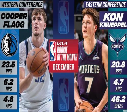 北京时间今日,NBA官方公布了12月最佳新秀,独行侠队状元秀库珀-弗拉格和黄蜂队4号秀康-克努佩尔当选,这也是二人连续第二个月荣获该奖项。