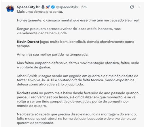 休媒总结了一下最近的三连败:我认为这支球队的精神疲惫才是关键,申京明显还没有痊愈就复出,杜兰特依旧打得不错,阿门险些打出赛季最佳一战虽然略有瑕疵,可全队缺乏防守强度,没有进攻积极性,缺乏对胜利的渴望。
